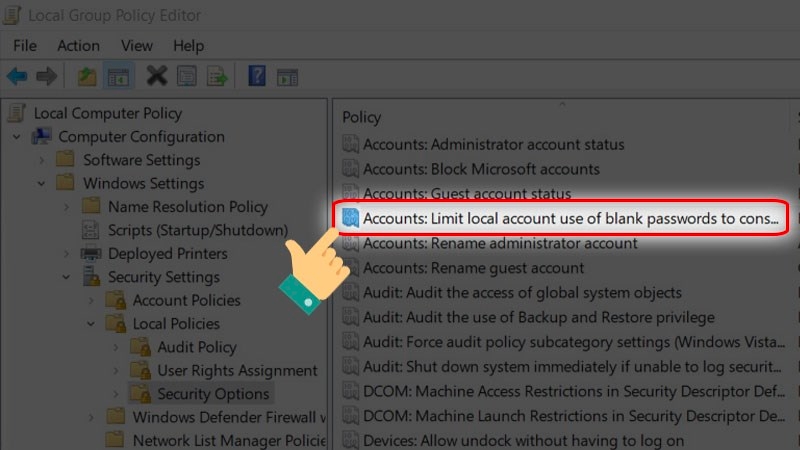 Bước 6: Tiếp theo, bạn nhấn đúp vào mục Accounts: Limit local account use of blank passwords to console logon only.
