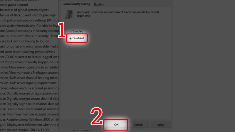Nhấn đúp vào mục Accounts: Limit local account use of blank passwords to console logon only