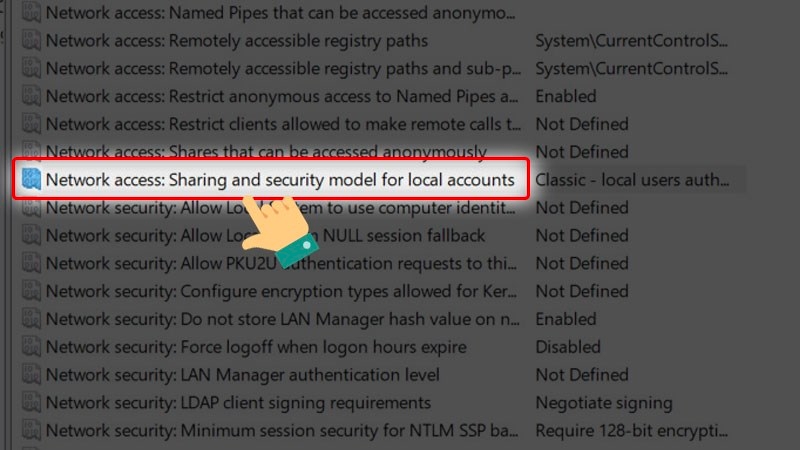 Nhấn đúp vào mục Network access: Sharing and security model for local accounts