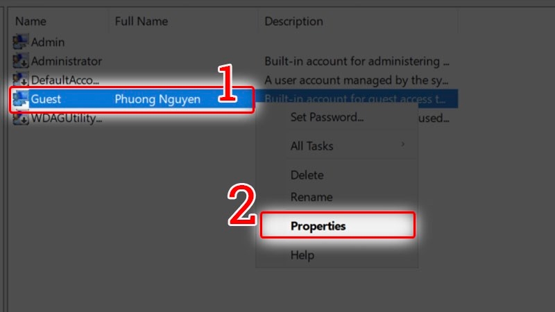 Bước 4: Giao diện mới hiện ra, tại mục Guest bạn nhấp chuột phải Guest và chọn Properties.