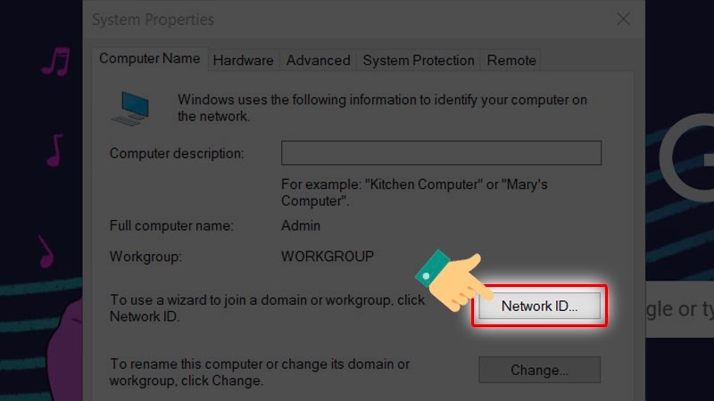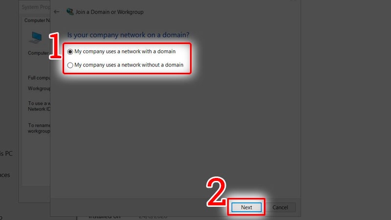 Nhấp chuột phải My Computer > Chọn Properties > Chọn Rename this PC > Nhấn vào Network ID > Tích vào This computer is part of a business network and use it to connect to the computers at work > Nhấn Next > Tích vào câu trả lời domain về máy (nếu máy có domain thì trả lời có) > Nhấn Next > Tiếp tục nhấn Next.