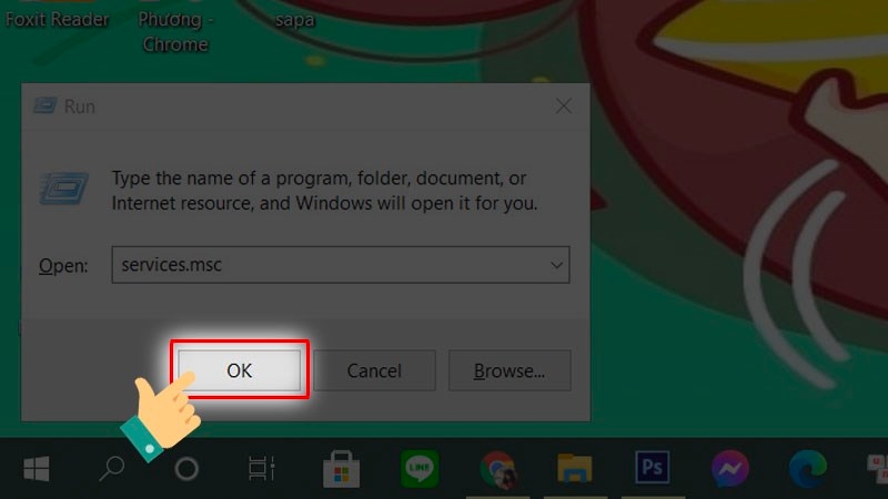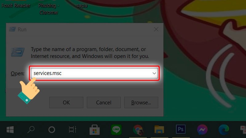 Nhập lệnh “services.msc” vào ô Open