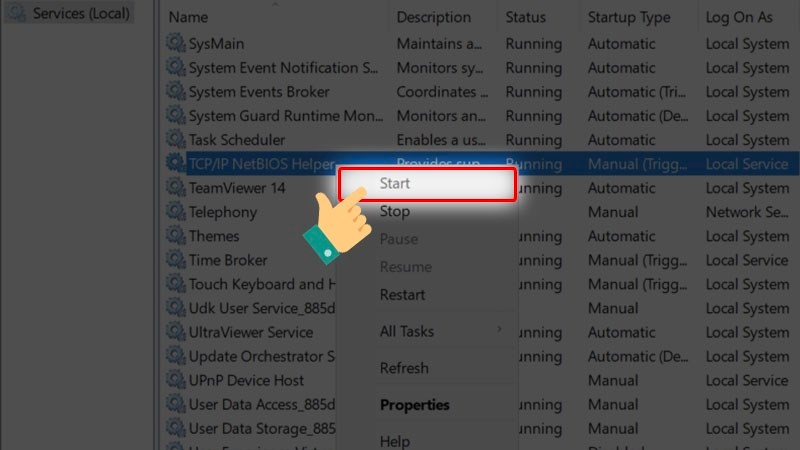 Nhấp chuột phải vào TCP/IP NetBIOS Helper và chọn Start