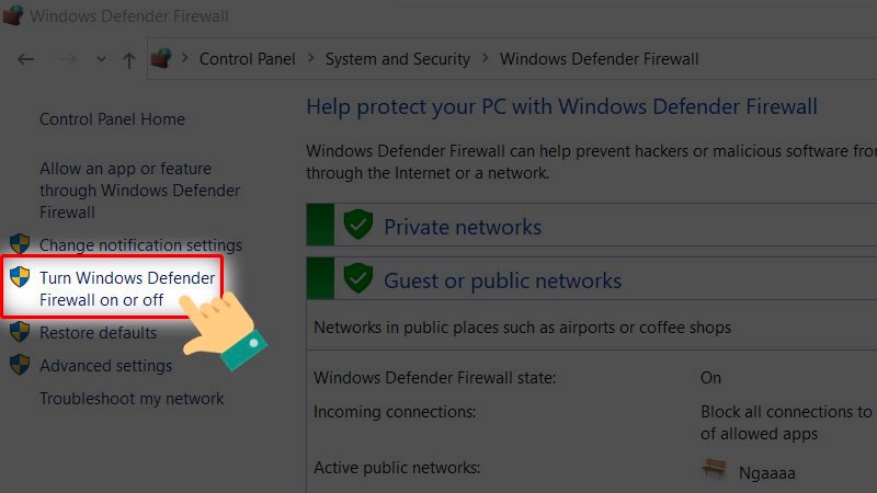 Vào Control Panel > Chọn System and Security > Chọn Windows Defender Firewall > Chọn vào Turn Windows Defender Firewall on or off > Nhấn Turn off cho cả mạng Private và Public > Nhấn vào OK để lưu thay đổi.