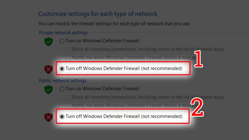 Nhấn Turn off cho cả mạng Private và Public