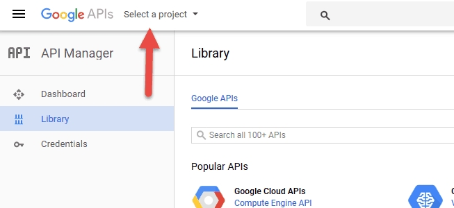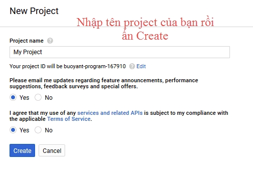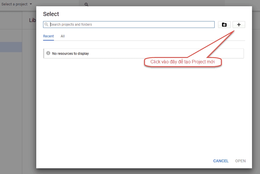 Click vào Select a project để tạo mới project. 1 project có thể chứa nhiểu API. 1 API có thể dùng cho nhiều website. tùy thuộc vào cài đặt của các bạn. Các bước như hình