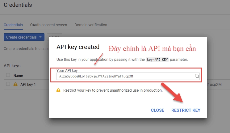 Tại đây bạn đã có API mà bạn cần. hãy copy nó để sử dụng. Ấn Restrict Key để tiếp tục cài đặt
