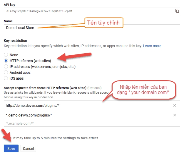 Tại đây hãy tiền tên cho API để sau này bạn biết nó dùng cho web nào hay ứng dụng nào. Chọn Http referrers (web sites) như hình và điền tên miền của bạn vào theo định dạng *.your-domain.com/* và http://your-domain.com/* => sau đó ấn Save để lưu thông tin